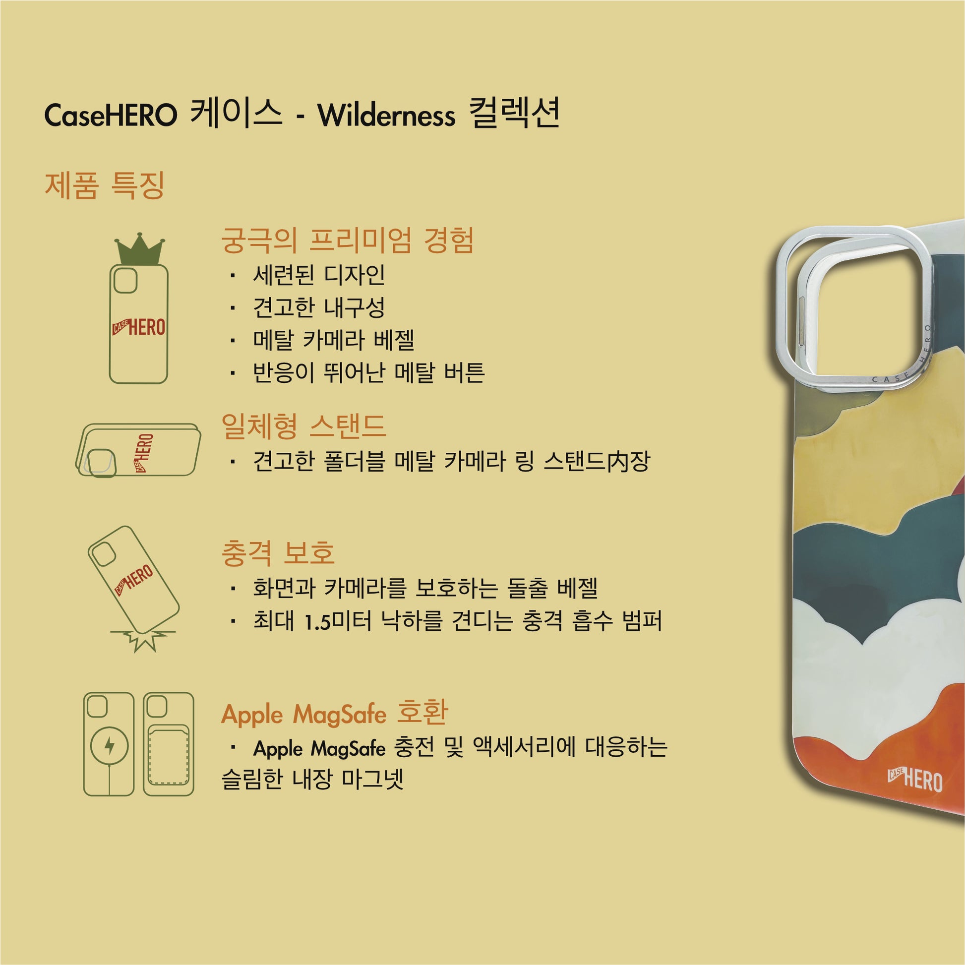 CaseHERO의 Wilderness 컬렉션은 끊임없이 변화하는 자연의 풍경에서 영감을 받았으며, 풍부하고 흐르는 풍경과 흙빛 톤을 통해 자연의 길들여지지 않은 아름다움을 포착하고자 했습니다.