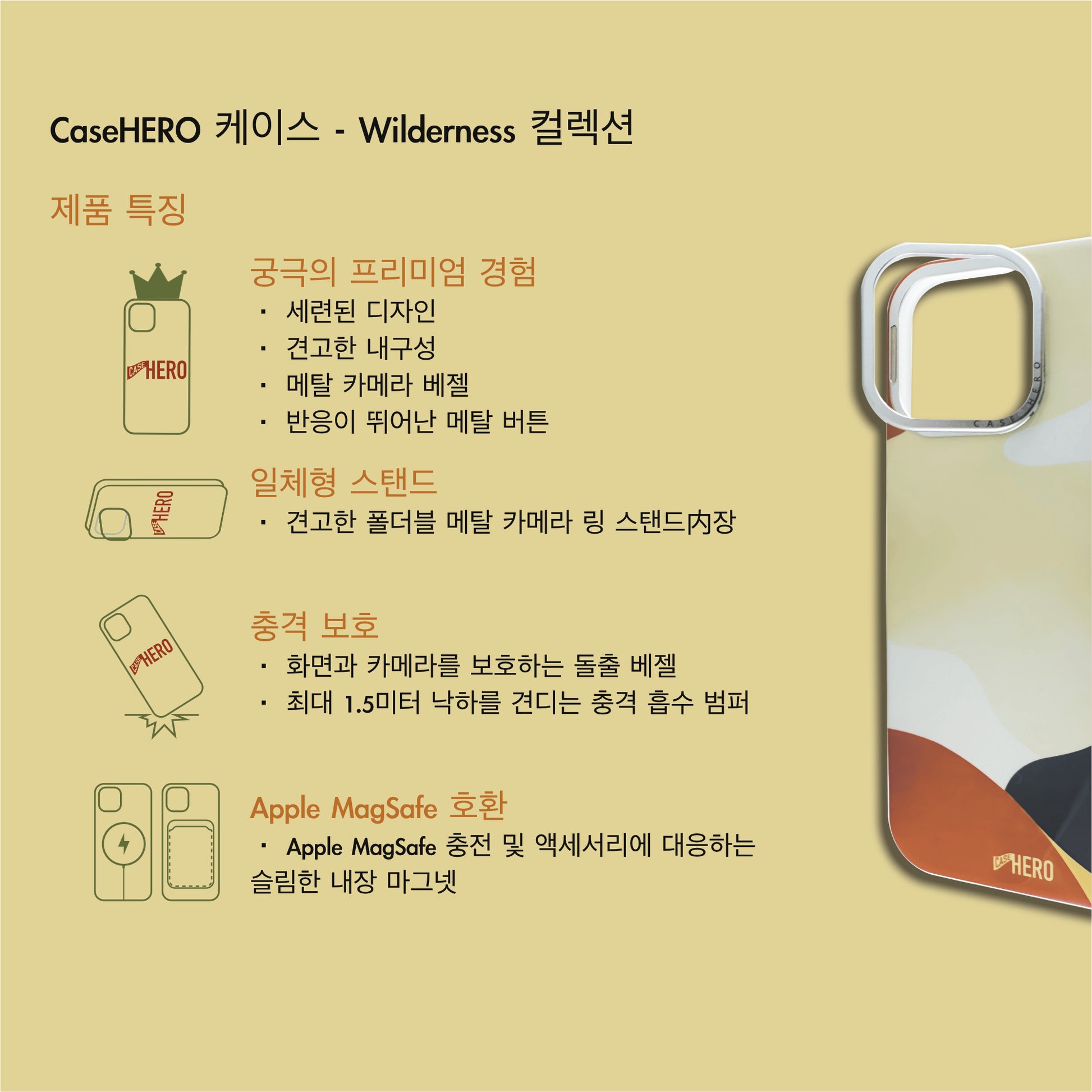 CaseHERO의 Wilderness 컬렉션은 끊임없이 변화하는 자연의 풍경에서 영감을 받았으며, 풍부하고 흐르는 풍경과 흙빛 톤을 통해 자연의 길들여지지 않은 아름다움을 포착하고자 했습니다.